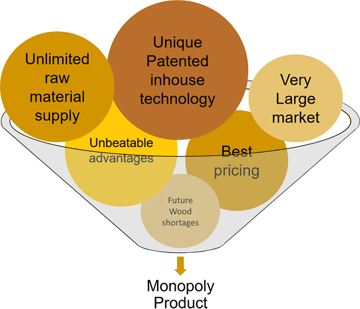 A company that has patented technology to convert an extremely abundant raw material into a product (wood) with ever increasing demand and diminishing supply due to constant law enforcement by countries over deforestation.