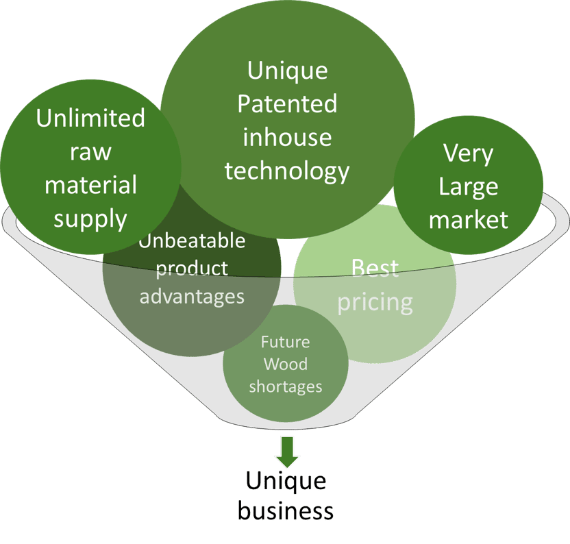 The company has patented technology to convert an extremely abundant and unwanted raw material (mix plastic waste) into a product (wood) with ever increasing demand and diminishing supply due to constant law enforcement by countries over deforestation.
